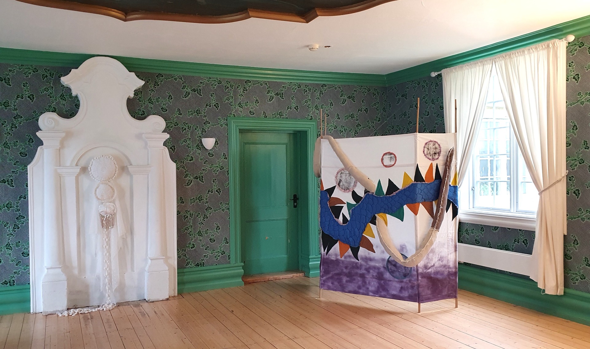 "Farmors kjærlighet" T.V "Magdalena" H 250 x B 160 x 30 et stedspesifikk verk 2025 og T.H "Lakenskrekk" H 210 x B 210 D 40 2025